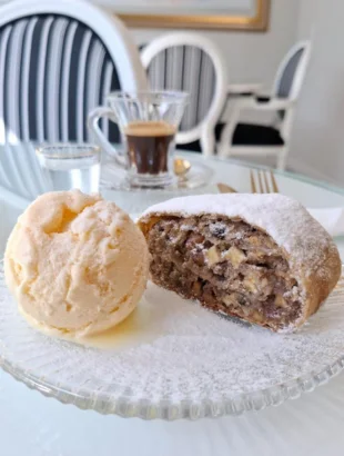 Nosso Strudel de maçã com nozes recheado de sabor, acompanhado de um sorvete cremoso, vai encantar seu paladar. Venha se perder nessa combinação irresistível.